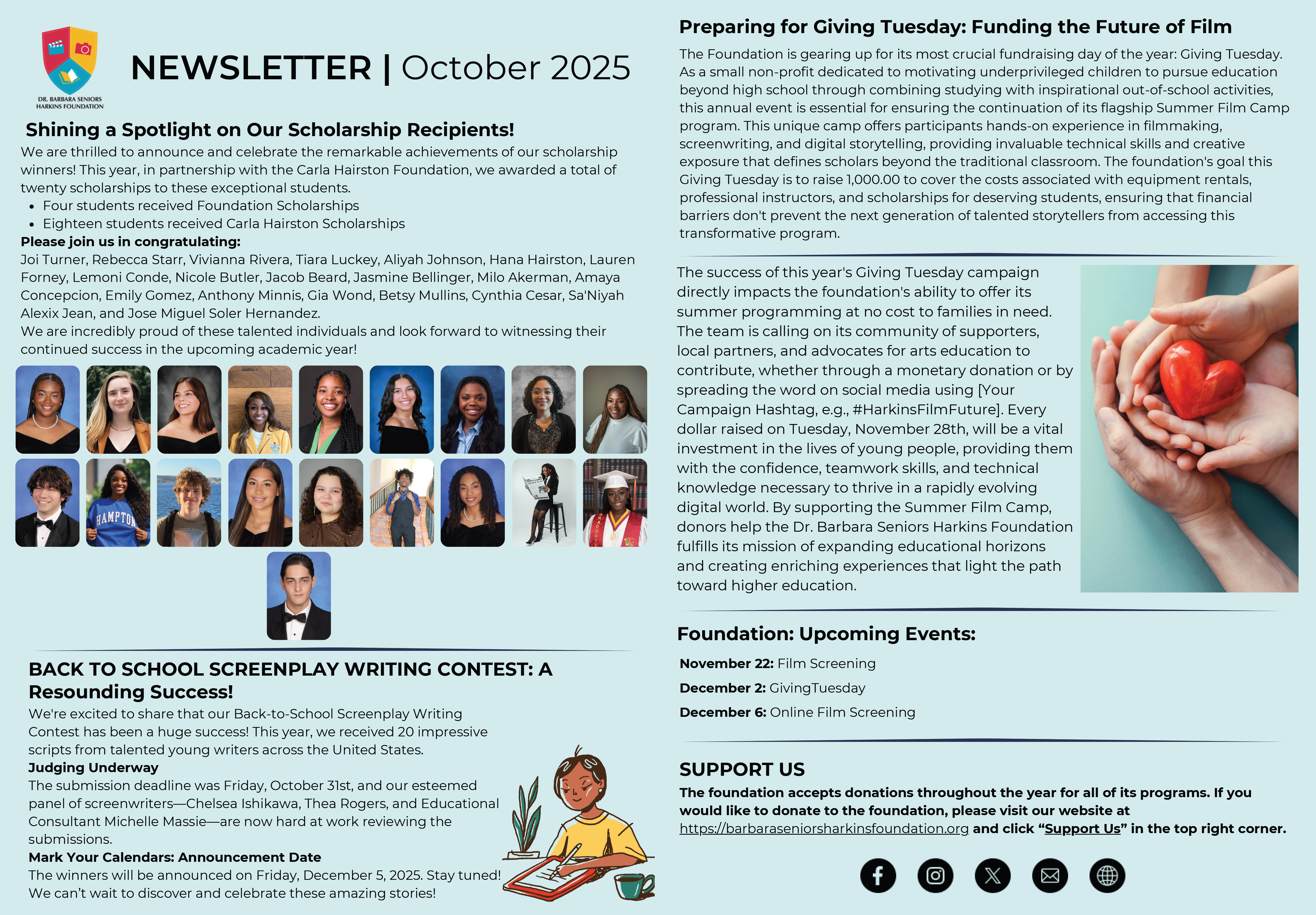 BACK TO SCHOOL SCREENPLAY WRITING CONTEST (2025-2026) The Dr. Barbra Seniors Harkins Foundation believes in the power of stories, especially those crafted by young, creative minds. That's why we're thrilled to announce the launch of the 2025-2026 Back to School Screenplay Writing Contest! Inspired by our founding vision in 2000…